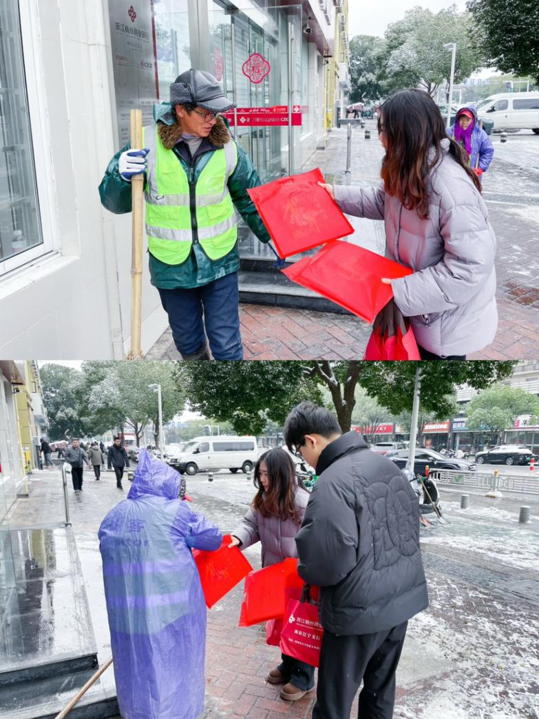 為向這群默默奉獻的“城市守護者”表達敬意與感謝,1月20日清晨,稠州銀行南京江寧支行工作人員提前準備,帶著滿載心意的新春掛歷、暖冬年禮以及真摯的祝福,走進掃雪一線。在積雪尚未融化的街頭,支行員工親手將一份份禮品送到正在忙碌的掃雪人員手中,并致以親切的問候:“辛苦了,新年快樂!”簡單的舉動,卻凝聚著深深的敬意與關(guān)懷,讓嚴寒中的戶外勞動者感受到來自社會的溫暖。