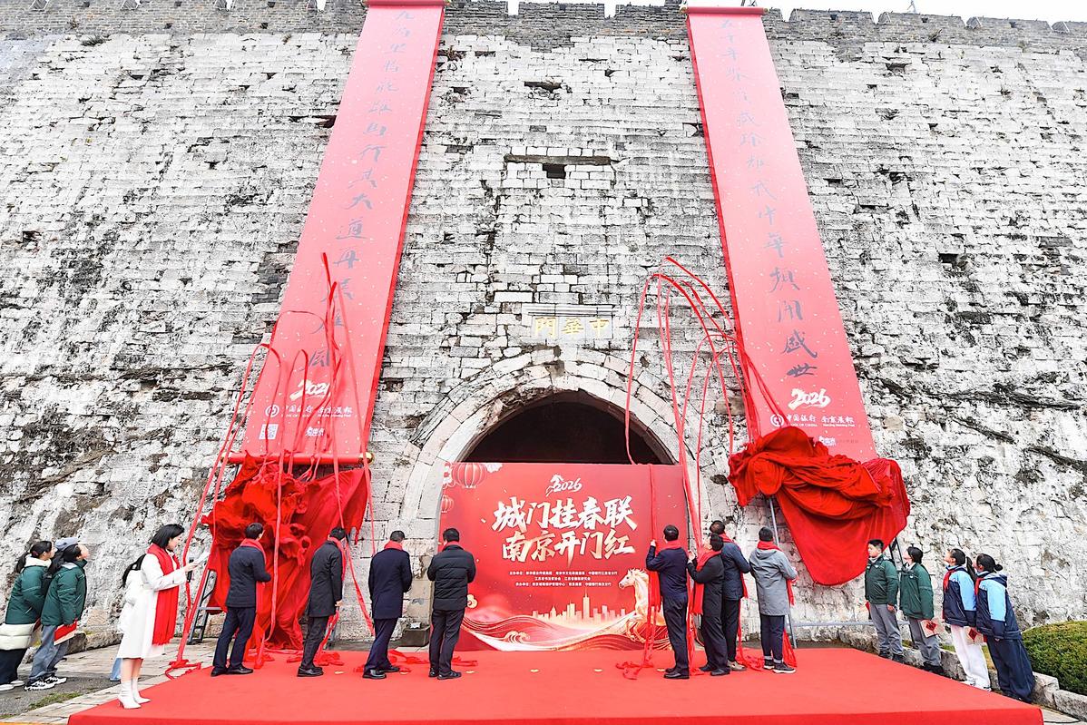 “五千年聚寶藏珍,耀我中華,頻開盛世;九萬里騰龍躍馬,行其大道,再展雄風?!币桓遍L十五米、寬兩米的巨幅大紅春聯(lián),于1月31日上午在南京中華門甕城震撼亮相,正式拉開丙午馬年新春序幕。由新華報業(yè)傳媒集團、南京市文化和旅游局、中國銀行江蘇省分行、江蘇省書法家協(xié)會、江蘇省楹聯(lián)研究會聯(lián)合主辦,南京城墻保護管理中心、南京晨報、中國銀行南京分行共同承辦的2026年第十一季“城門掛春聯(lián) 南京開門紅”揭聯(lián)儀式,在中華門隆重舉行。南京市領(lǐng)導及各單位相關(guān)負責人出席。中國銀行江蘇省分行副行長兼南京分行行長陳新宏出席揭聯(lián)儀式并致辭。