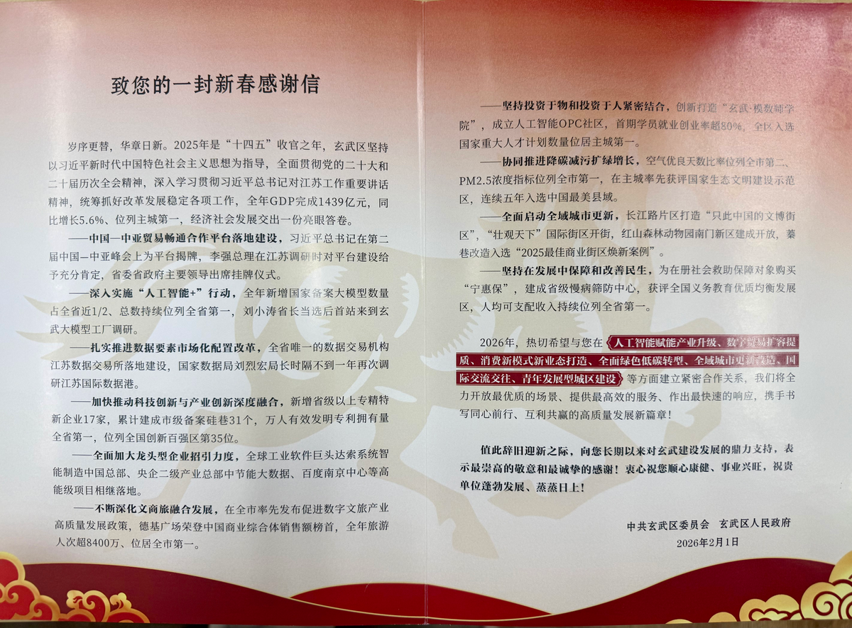感謝信中,玄武區(qū)回顧了2025年在經(jīng)濟(jì)建設(shè)、科技創(chuàng)新、產(chǎn)業(yè)融合、民生改善等領(lǐng)域取得的豐碩成果:人工智能、數(shù)據(jù)要素市場化、綠色低碳、城市更新等工作走在省市前列;尤其在中國—中亞貿(mào)易暢通合作平臺(tái)建設(shè)上,獲得了中央及省市領(lǐng)導(dǎo)的充分肯定。同時(shí),玄武區(qū)明確2026年將聚焦人工智能賦能產(chǎn)業(yè)升級(jí)、數(shù)字貿(mào)易擴(kuò)容提質(zhì)、消費(fèi)新模式新業(yè)態(tài)打造、全面綠色低碳轉(zhuǎn)型、全域城市更新改造、國際交流交往、青年發(fā)展型城區(qū)建設(shè)等重點(diǎn)方向,為金融機(jī)構(gòu)提供優(yōu)質(zhì)發(fā)展場景與高效服務(wù)保障。