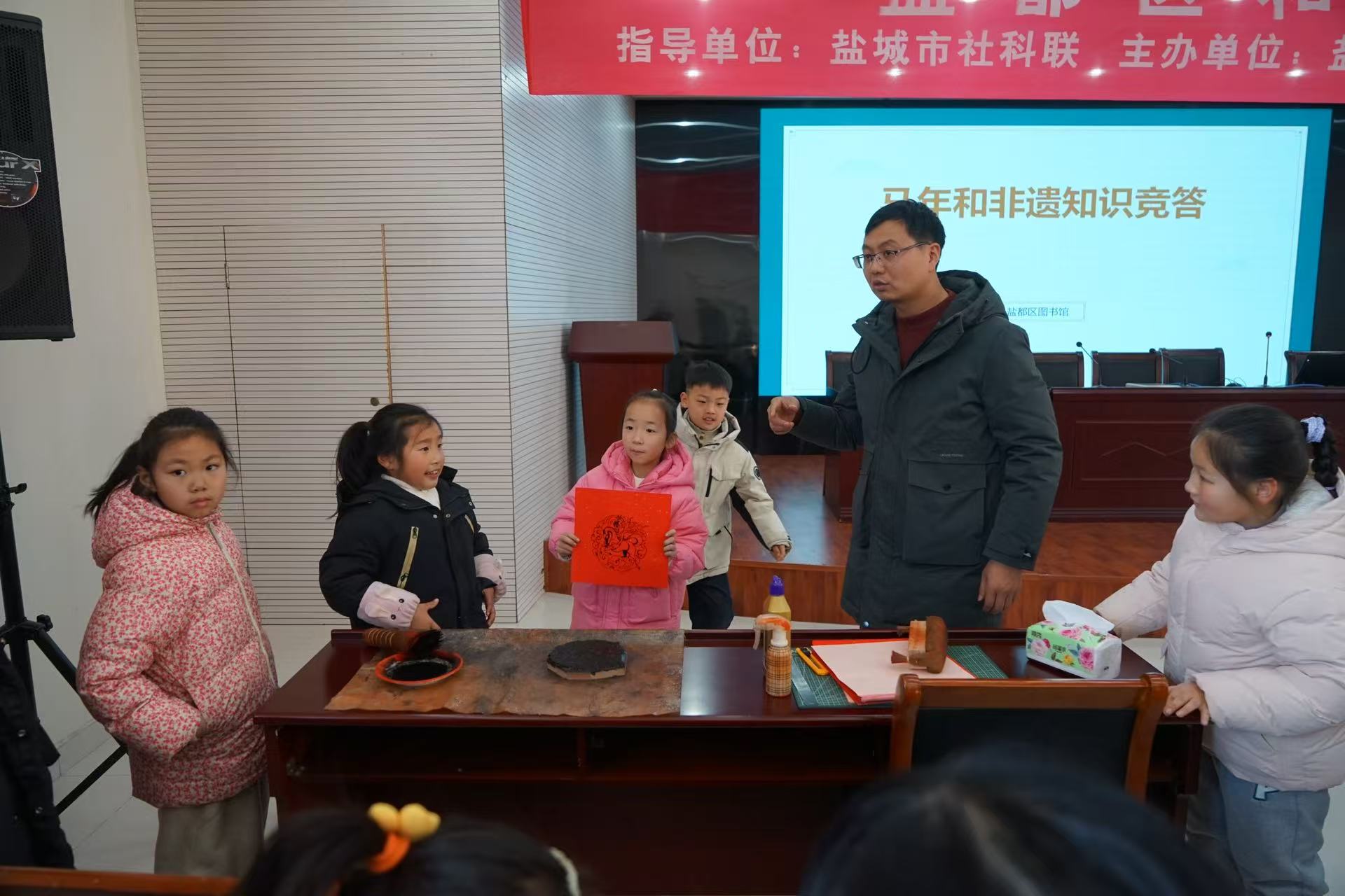 繪本共讀的溫情尚未消散,馬年和非遺知識(shí)競(jìng)答環(huán)節(jié)便點(diǎn)燃了大家的熱情。“馬在十二生肖中排第幾位?”“雕版印刷是我國(guó)哪個(gè)時(shí)期發(fā)明的?”一系列兼具趣味性與知識(shí)性的問(wèn)題提出后,孩子們紛紛舉手搶答,眼神中滿是自信與期待。工作人員為每位答對(duì)問(wèn)題的小朋友送上了精心準(zhǔn)備的小禮品,拿到禮品的孩子們臉上洋溢著燦爛的笑容,在歡樂(lè)的氛圍中收獲了滿滿的知識(shí)。