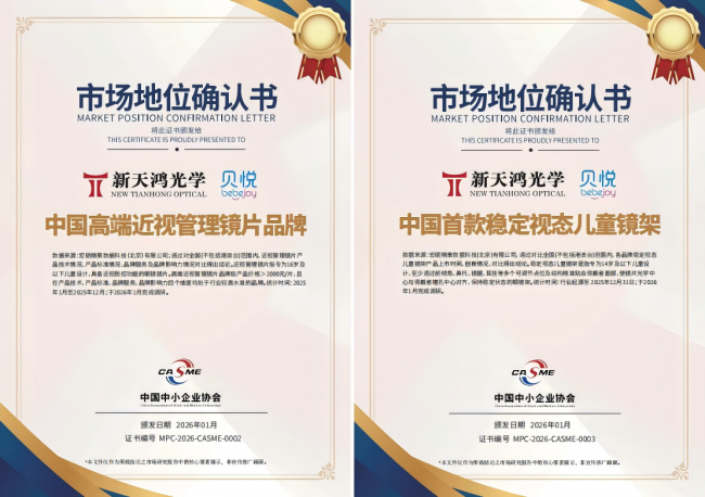 根據(jù)分析頭部高端近視管理鏡片品牌的產(chǎn)品特點(diǎn),同時(shí)對(duì)全渠道高端近視管理鏡片品牌產(chǎn)品的市場(chǎng)銷售情況和行業(yè)的深入調(diào)研,宏礪精策確認(rèn):新天鴻光學(xué) “中國(guó)高端近視管理鏡片品牌”“中國(guó)首款穩(wěn)定視態(tài)兒童鏡架”兩項(xiàng)市場(chǎng)地位。
