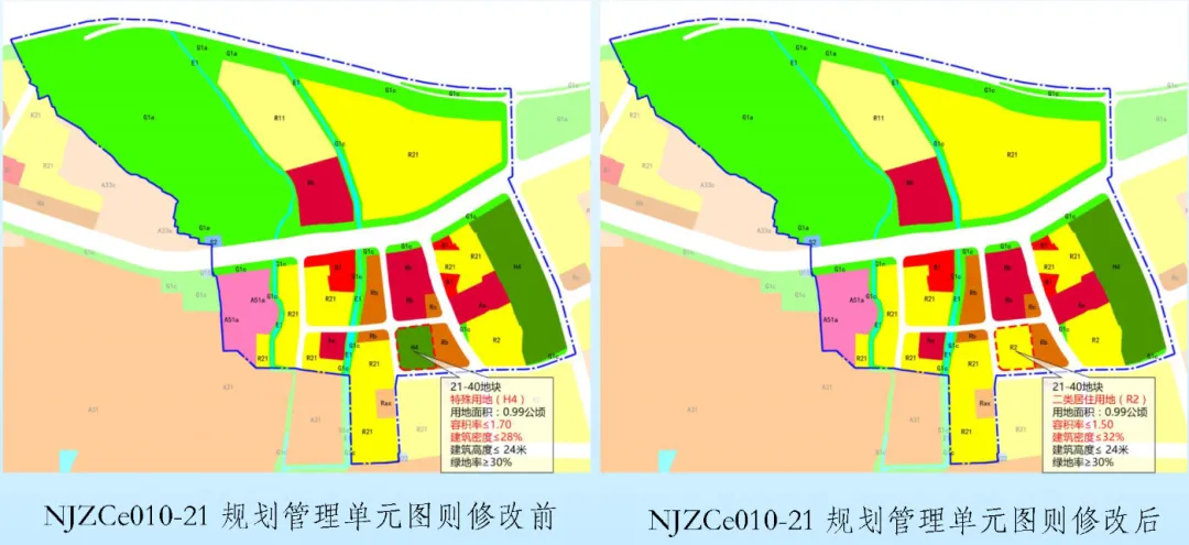 將21-40地塊用地性質(zhì)由特殊用地(H4)調(diào)整為二類居住用地 (R2),容積率由≤1.7調(diào)整為≤1.5,建筑密度由≤28%調(diào)整至≤32%;