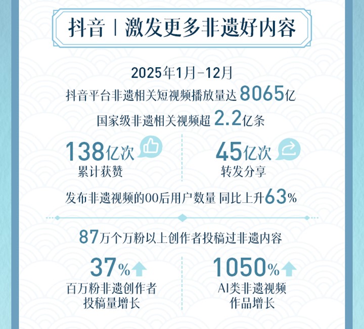 過去一年,越來越多非遺項目通過抖音獲得關(guān)注?!秷蟾妗凤@示,2025年,抖音平臺上發(fā)布國家級非遺相關(guān)視頻數(shù)量超2.2億條,累計獲贊138億次,獲得45億次轉(zhuǎn)發(fā)分享。87萬名萬粉以上創(chuàng)作者投稿過非遺內(nèi)容,百萬粉非遺創(chuàng)作者投稿量增長37%,發(fā)布非遺視頻的00后用戶數(shù)量同比增長63%。各類創(chuàng)作者們通過生動的短視頻展示非遺技藝的獨特魅力,有效擴(kuò)大了非遺的社會影響力。