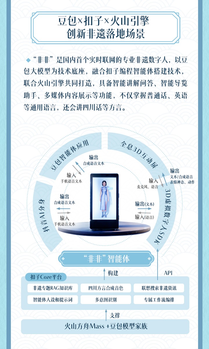 依托字節(jié)跳動的技術(shù)優(yōu)勢,“抖音非遺計劃”還創(chuàng)新了非遺落地場景。在2025年第九屆成都國際非遺節(jié)上,由豆包、扣子、火山引擎聯(lián)合打造的國內(nèi)首個實時聯(lián)網(wǎng)專業(yè)非遺數(shù)字人“非非”正式亮相,其具備智能講解問答、導(dǎo)覽助手、多媒體展示等功能,不僅會說普通話、英語,還精通四川話等方言;而由即夢AI打造的《2025抖音非遺百景圖》,則聯(lián)合多位抖音創(chuàng)作者生成23組作品,以數(shù)字形態(tài)煥新呈現(xiàn)19種非遺技藝。