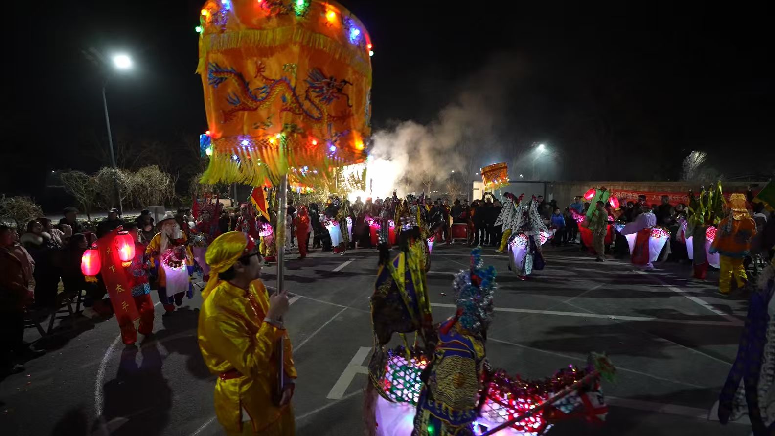 與傳統(tǒng)馬燈嚴(yán)整的列隊(duì)不同,里佳山的“亂草馬燈”自有一股山野間的奔放與自由。在令旗指揮下,十四匹“駿馬”與兩頭“神?!比绾榱靼阌咳霃V場(chǎng),先后變換出八字陣、長(zhǎng)蛇陣、剪刀陣等經(jīng)典陣型。剎那間,燈光流動(dòng),時(shí)而如萬馬奔騰氣勢(shì)如虹,時(shí)而似游龍穿梭靈動(dòng)自如,一招一式剛勁有力,將民間武術(shù)的筋骨與傳統(tǒng)舞蹈的神韻完美融合。